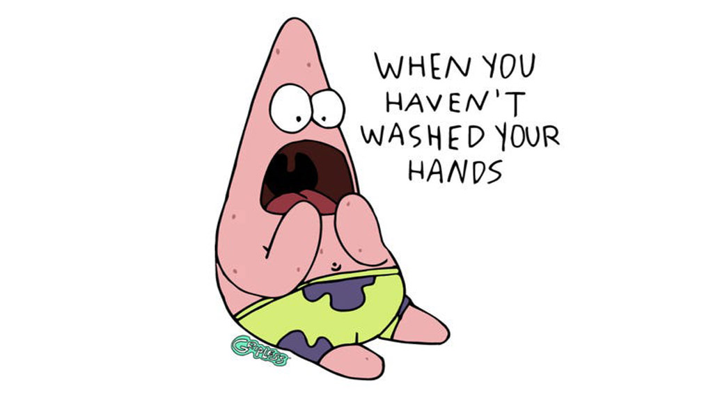 Патрик из мультсериала «Губка Боб» переживает, что не помыл руки. Не будьте как Патрик — мойте руки!