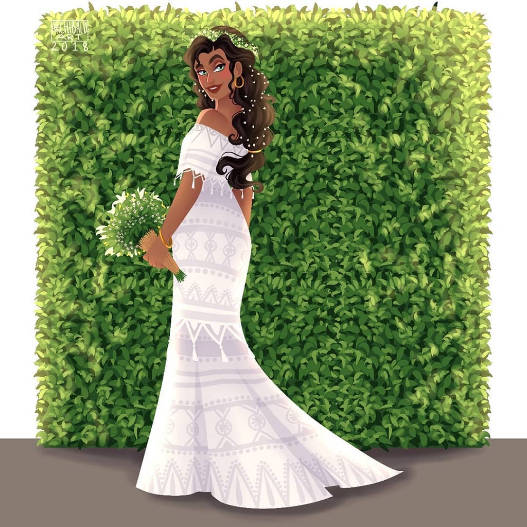Платье Эсмеральды напоминает её обычные наряды, но всё же остаётся празднично-свадебным. Тоже не принцесса, но как не показать такую красоту?