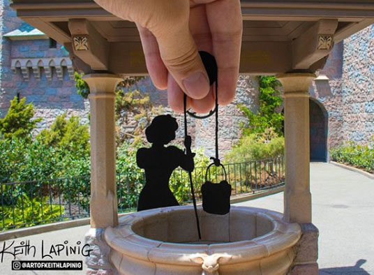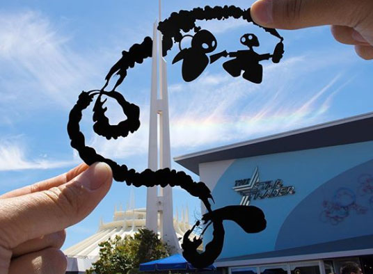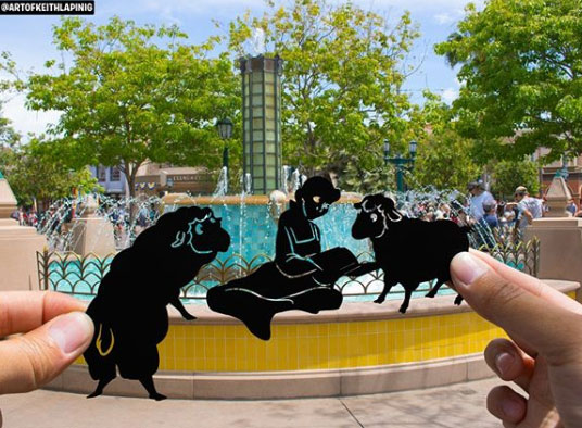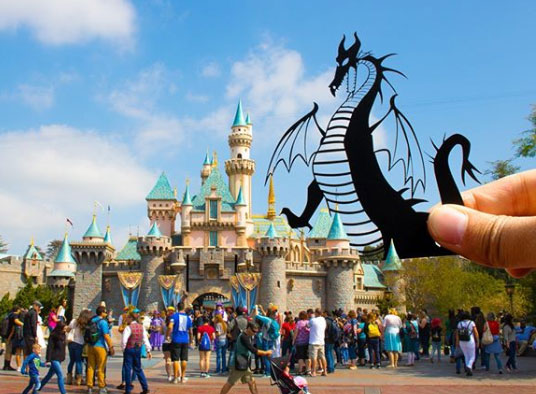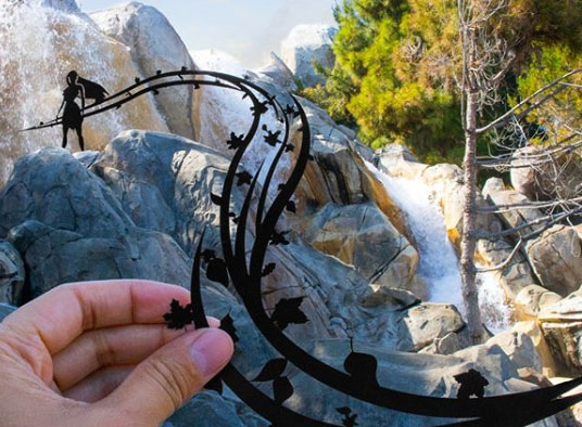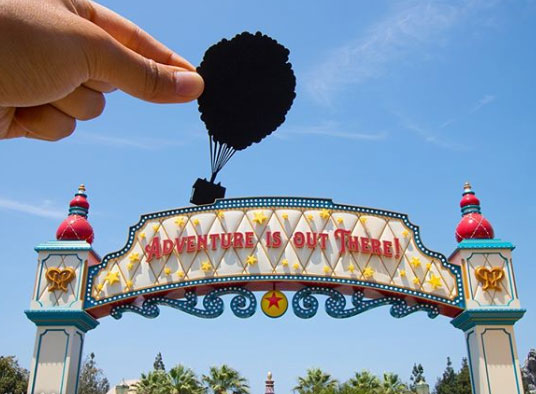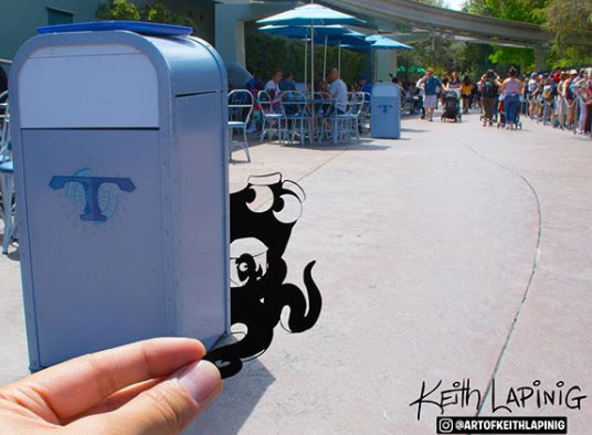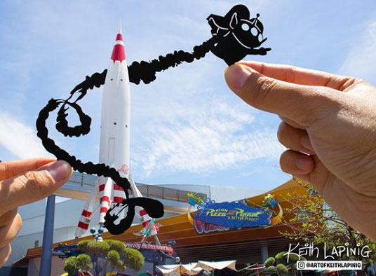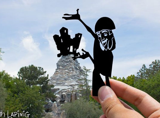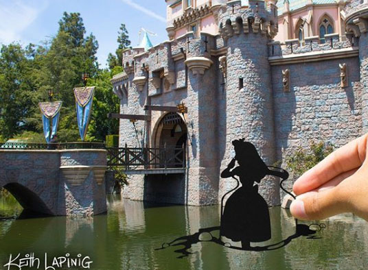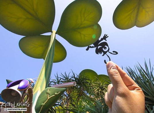 Художник Кейт Липнинг из США работает менеджером и интерактивным дизайнером в Диснейленде. И само место работы подсказывает идеи для его [данные удалены]. Например, что будет, если вырезать из бумаги персонажей мультфильмов и сделать их фото на фоне парка?