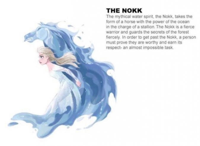 Нокк — водный дух, который владеет силой океана и способен принимать форму лошади. Он отважный воин, охраняющий тайны леса. Именно с ним Эльза встречается в глубине океана, когда пытается покорить его волны в тизере. Возможно, таким образом она пыталась доказать Нокку, что достойна чего-то. Имя Нокка позаимствовано из скандинавских мифов, где так называют духа воды, способного принимать формы различных созданий.