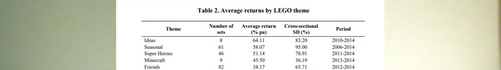 Из доклада следует, что средний ежегодный доход от LEGO не менее 11%, а редкие наборы по «Звёздным войнам» и «Гарри Поттеру» превосходят акции и облигации крупных компаний США по уровню дохода. А всё дело в том, что старые комплекты можно перепродать в несколько раз дороже. Пример: в 2014 году набор Star Wars Darth Revan был куплен за 4 доллара, а в 2015 он был продан за почти 29 долларов. А это значит, что прибыль равна 613%!