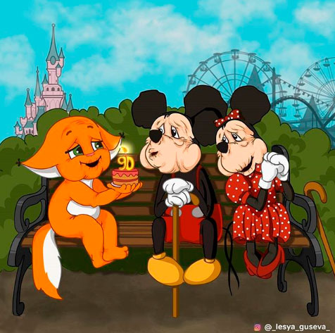 Ну и юбиляр прошлого года, 90-летний мышонок Микки, его возлюбленная Минни и Крошка Ши — знаменитая белка с интернет-мемов. Поздравляем, старички!