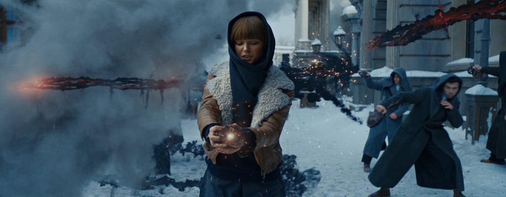 Не будем забывать и про цветовую гамму. Взрослые отлично понимают, что мультфильмы создают яркими не просто для красоты, а для простоты восприятия. За светлыми и цветастыми героями легче следить, они сами по себе вызывают симпатию. Здесь же большая часть фильма проходит в серых тонах, город засыпан снегом, практически объявлено осадное положение, строго соблюдается комендантский час и опасность таится за каждым углом.