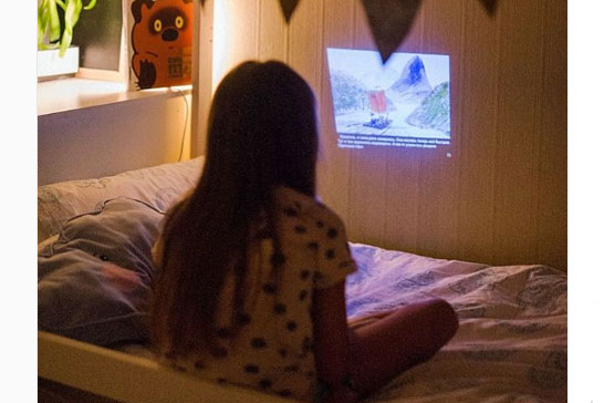 Родители любят диафильмы, это в самое яблочко. Это напоминает им об их детстве и это объединяет. Они с детьми вместе читают, обсуждают. Вот у нас двухъярусная кровать, сложно читать — один ребенок не видит картинку. А тут все смотрят на потолок, все видят и слышат, родители это любят.