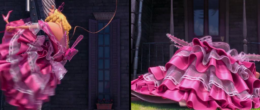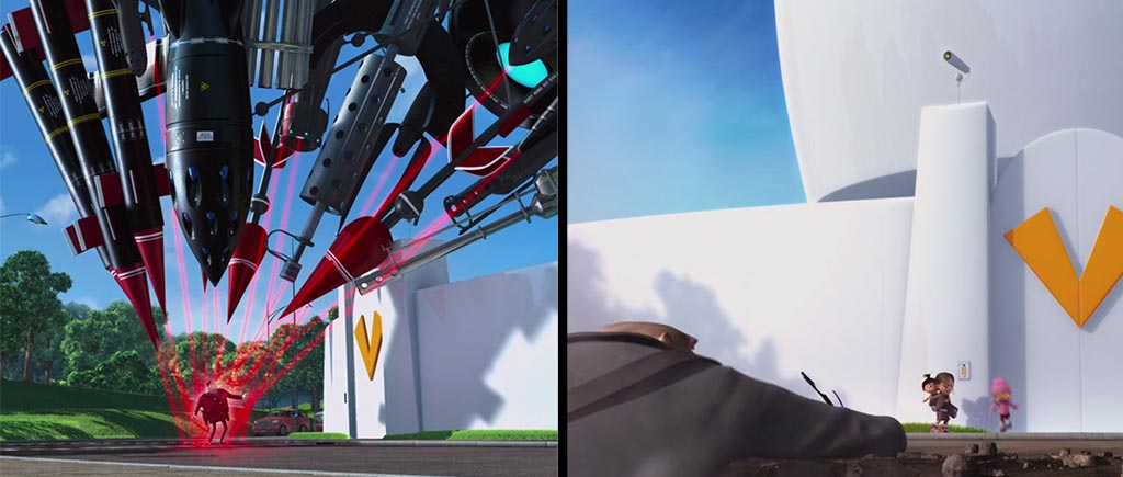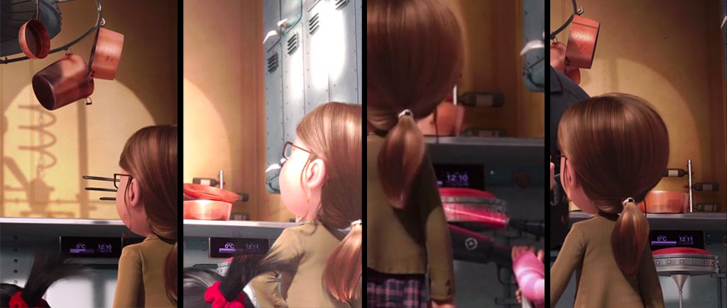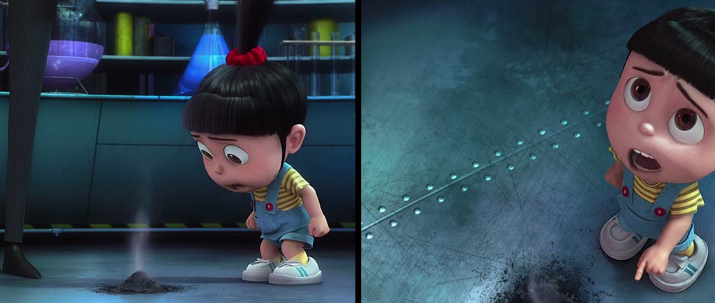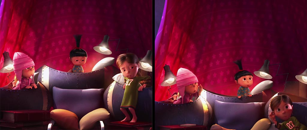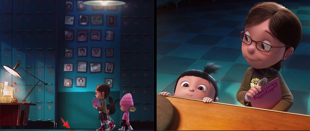 А вот здесь милашка Агнесс на доли секунд появляется перед миньонами, но при смене кадров и до, и после ее там «не стояло». Скоростная телепортация, не иначе.
