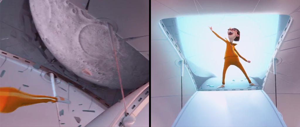 Корабль Вектора имеет навык регенерации: вот Луна пропарывает вход изнутри, сея осколки и хаос, а вот вполне прилично выглядящий проем несколькими сценами позже.