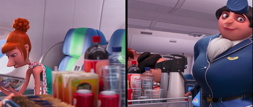 Похожую прыть демонстрирует содержимое тележки Грюардессы. Подъехала с одним набором банок, с другого ракурса показан совсем иной. Поменялись вместе с внешностью женщины? Тогда почему на банках не Грю? Кстати, в этой сцене Люси открыла дверь летящего самолета. Потрясающе сильная женщина!