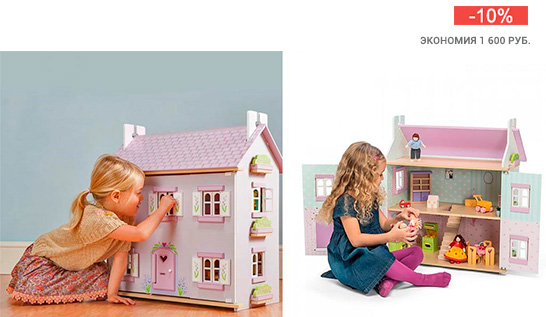 Трёхэтажный, наполненный мебелью и декоративными элементами. В таком любому взрослому захочется жить, а значит, и куколки ребёнка будут в полном восторге.