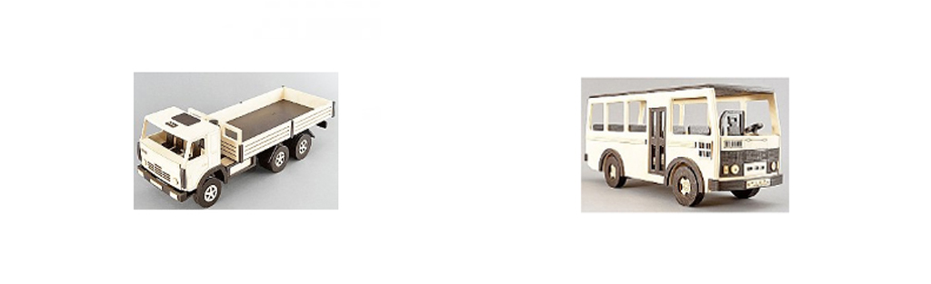 Может интересно что-то потяжелее, вроде грузовика или микроавтобуса? У нас и такое имеется. Все детали, кстати, сделаны из берёзы и берёзовой фанеры. Рекомендовано детям от шести лет. Потратив несколько часов на сбор такого грузовика, им можно как активно играть, так и поставить на полку в качестве декоративного украшения.