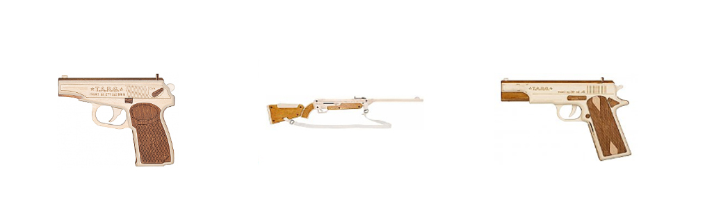 Ещё есть отличная и стильная сборная деревянная модель автомата Invader, к набору прилагается всё, что необходимо для сборки. Про карабин «Сарыч» слышали? Вот вам, точнее, вашему ребёнку, будет интересно повозиться и собрать такую модель. Производители строго против насилия, а значит, стрелять такому автомату нечем, что лишний раз позволяет задействовать фантазию.