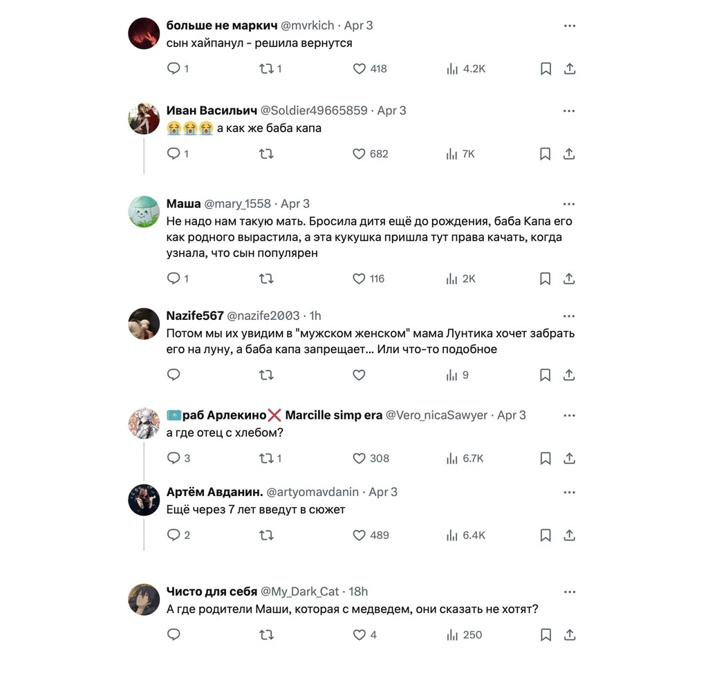 Пользователи соцсетей массово вспомнили, что подобные истории воссоединения родителей с детьми обычно заканчиваются скандальными выпусками шоу «Мужское / Женское». А ещё подумали о том, что кроме мамы у Лунтика вроде как должен быть и папа. Возможно, его герои будут искать уже в следующем фильме?