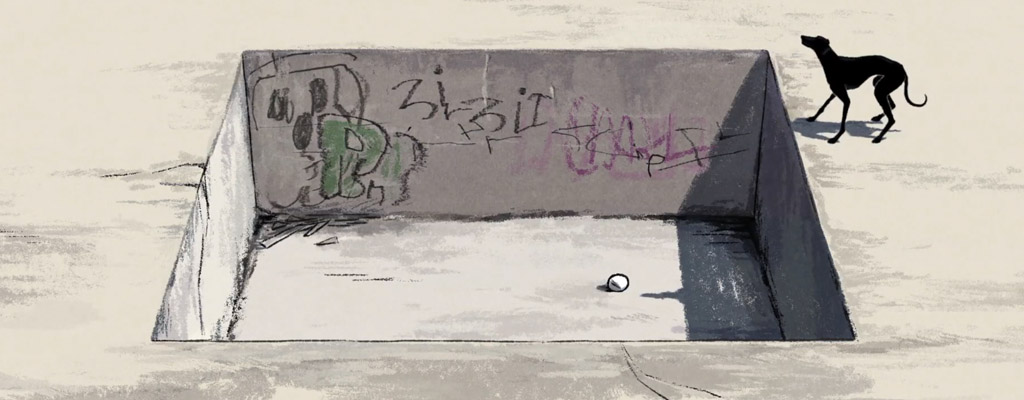 В кадре мы не увидим людей, лишь собак. Они чёрными пятнами своих тел и острыми линиями движений будут выделяться даже в кромешной темноте. Стая живёт возле многоквартирного дома, их будни не так насыщенны, как может показаться. Людей нет, еды нет, ничего, кажется, нет. Пока не появляется мячик, не завязывается игра, и одна собака не теряется.