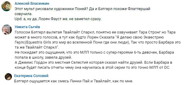 В Интернете появилось два новых ролика к грядущему мультсериалу «DC Super Hero Girls», который должен выйти на Cartoon Network в этом году. Над мультиком работали создатели другого успешного проекта — «Дружба — это чудо». Даже главную героиню Бэтгёрл озвучивает Тара Стронг, которая подарила свой голос Сумеречной Искорке. И фанаты не могли не заметить сходство этих сериалов.