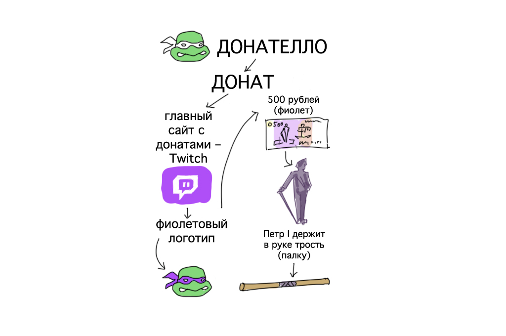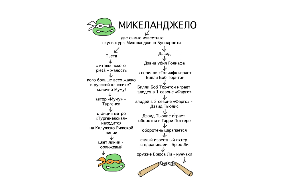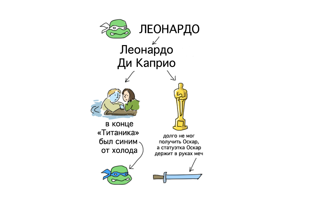 Никогда не могли запомнить, кто из черепашек-ниндзя Леонардо, а кто Рафаэлло? К счастью, художник с ником Duran составил необычные подсказки по цветам черепашьих повязок и их оружию. Правда, они крайне странные, но мы верим, что эти иллюстрации и правда могут кому-то помочь. Ведь способ строить ассоциативные забавные цепочки для запоминания действительно работает, попробуйте сами.