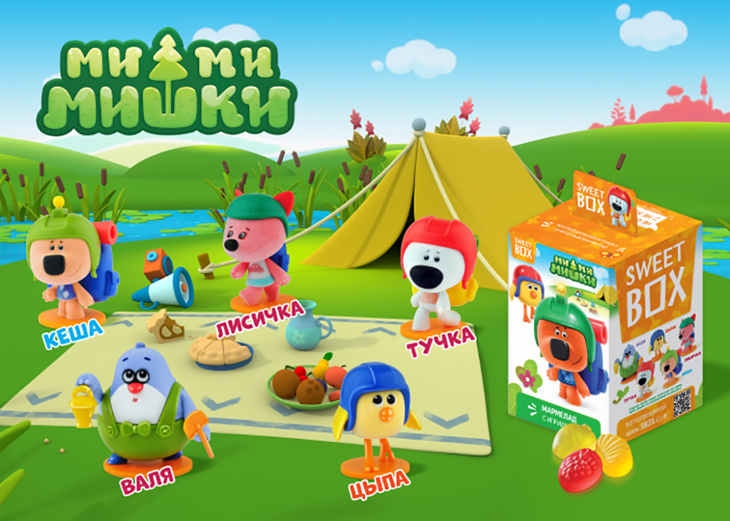 Что есть в наборе? В каждой коробочке найдётся вкуснейший мармелад с натуральным фруктовым соком, лифлет с подробным описанием и коллекционная игрушка с персонажами «Ми-ми-мишек» в соответствующей экипировке. Соберите их всех, чтобы никто не скучал без друзей.