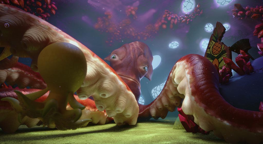 «Подводная эра» — постапокалиптический мультик. Люди погубили Землю и отправились в космос (привет, ВАЛЛ-И!), континенты скрылись под толщей воды, да и в самой воде жизнь вроде как совсем прекратилась. Но, разумеется, не везде — суровый осьминог Кракен нашел укромную изолированную впадину и мудро правит там горсткой выживших подводных обитателей.