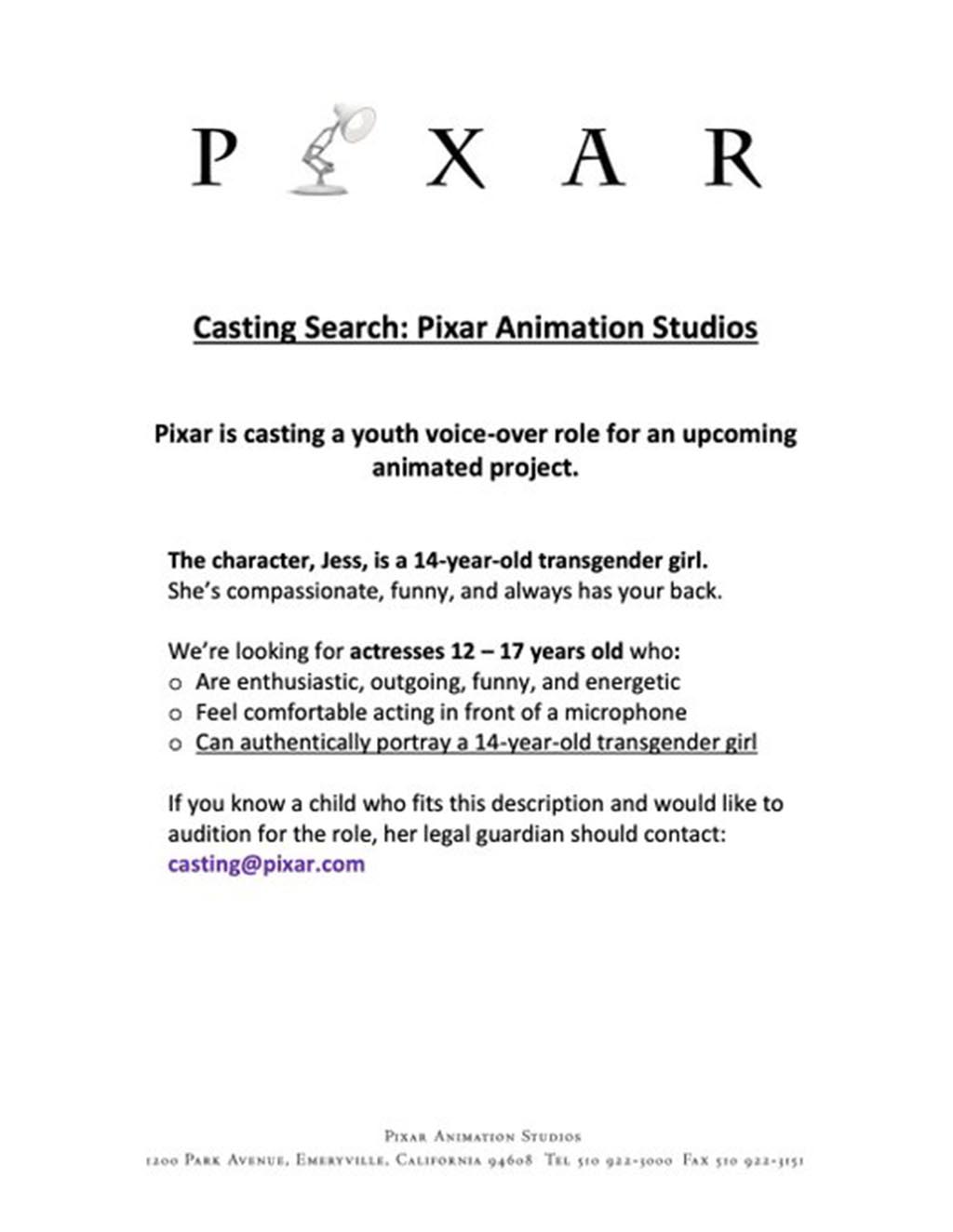 Для своего нового мультфильма студия ищет актрису 12−17 лет, которая сумеет достоверно и правдиво передать голос юной трансгендерной девочки. Ни название, ни описание анимационного проекта не разглашаются, но в уведомлении, выложенном в Твиттере, обозначено, что именно ищет отдел кастинга Pixar: