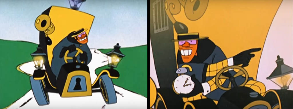 А вот загадочные фонари на машине гениального сыщика из мультфильма «По следам бременских музыкантов». Сначала их два, потом один, перепрыгивающий с одной стороны на другую. Сыщику с такой умной техникой точно лишняя помощь не нужна.