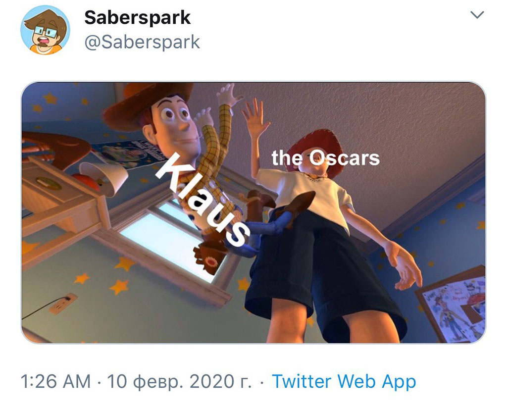«Отдать статуэтку за лучший анимационный фильм насквозь вымученной истории игрушек 4, когда есть Клаус — это, конечно, главный позор этого Оскара.»