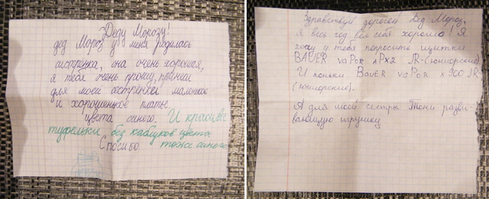 «Первое письмо — Матвею 10 лет, в этот год попросил подарок только для сестры, желание исполнилось — дед Мороз принес синее платье и синие пинетки! Для сына покупали подарок сами, наугад. Второе — Матвею 11 лет, щитки получил, развивающую игрушку сестра тоже получила. Коньки выдали в хоккейной школе»