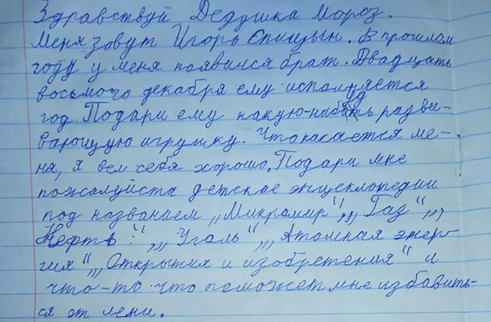 Сегодня мы публикуем подборку таких писем — от девочек и мальчиков, со скромными и сказочными запросами. К некоторым прилагаются комментарии родителей.