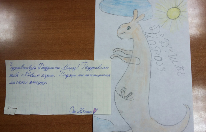 «Нынче моя 2-клашка настрочила такое письмо и рисунок приложила)) Сбилась с ног, ищу кенгуру уже вторую неделю».