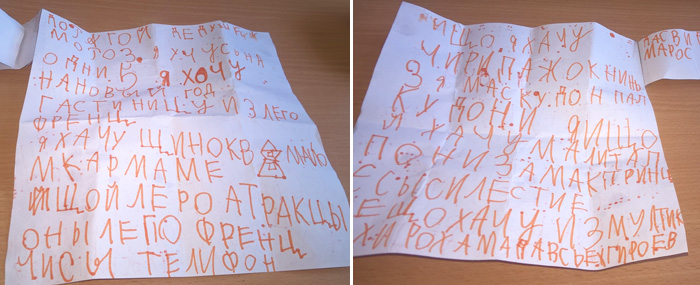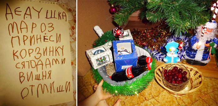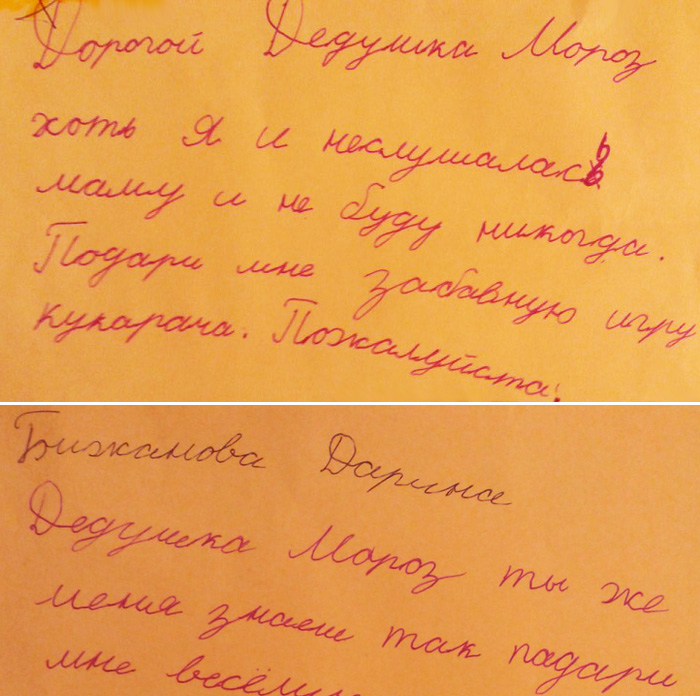 «Сын, 10 лет, писал в этом году, в день рождения Деда Мороза, положил в морозилку. То что от сестры восьмимесячной написал, позабавило».