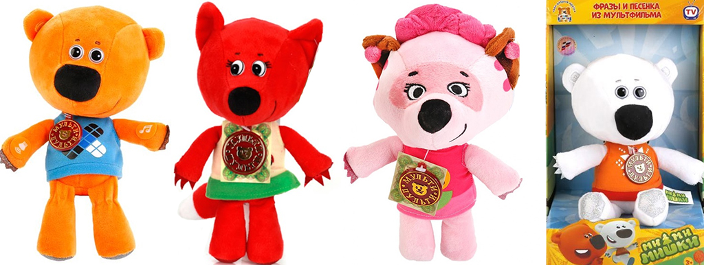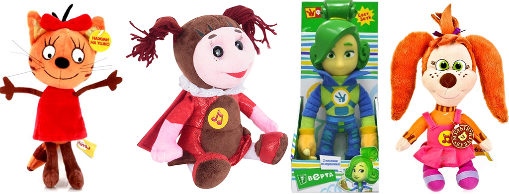 Кроме того, в наличии есть мягкие игрушки Милы из «Лунтика», Лизы из «Барбоскиных», Карамельки из «Трёх котов». И они тоже разговаривают и поют! Игрушка Верты из «Фиксиков» частично мягкая, а частично нет (конечно, ведь причёску нужно беречь) и она тоже подойдёт тем, кто не любит озвучивать мысли своих игрушек. Верта, кстати, укомплектована как всамделишний фиксик — она покажет и световые эффекты.