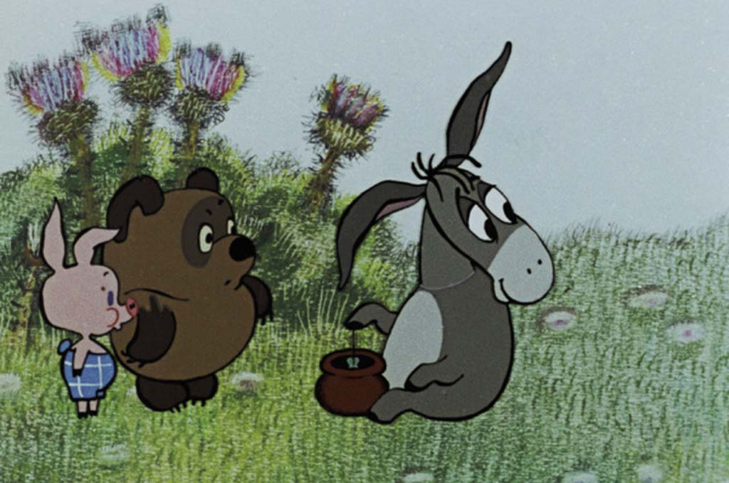 О чём: Известный медвежонок в советской интерпретации общается с разнообразными друзьями, ходит в гости и на Дни рождения, знакомится со злыми пчёлами и притворяется тучкой, а вовсе не медведем.