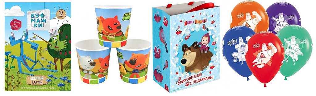 Товары со «Сказочным Патрулём», «Ми-ми-мишками», «Машей и Медведем», «Фиксиками» и другими любимыми героями порадуют и детей, и взрослых. А воздушные шарики, подарочные пакеты и бумажные стаканчики с любимыми героями, которые можно получить в подарок к заказу, помогут сделать новогоднюю вечеринку ещё более классной и яркой!