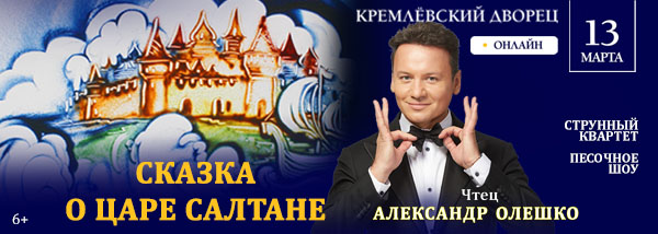 Первую сказку в онлайн-формате зрители смогут увидеть уже 13 марта. Юным зрителям, а также их родителям заслуженный артист России Александр Олешко в сопровождении песочного шоу Лилии Чистиной и струнного квартета «Мелодион» расскажет произведение Александра Сергеевича Пушкина «Сказка о царе Салтане».