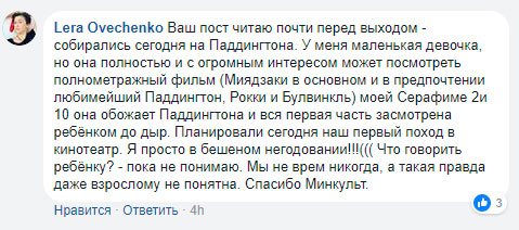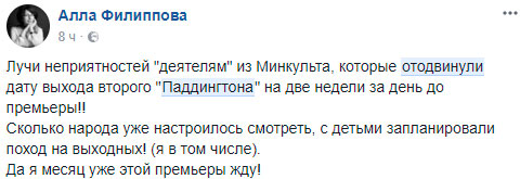 Название этого «иного фильма» в министерстве не озвучили, но и мнение СМИ о том, что это «Скиф» они не опровергают. Проблема в том, что о переносе было сообщено всего за день до выхода фильма, а билеты на него начали продаваться уже в декабре прошлого года. Многие родители просто расстроены или даже злы, так как дети давно хотели увидеть продолжение приключений мишки Паддингтона. Да и взрослые тоже. Мы собрали комментарии пользователей соцсетей об этом событии и делимся ими с вами: