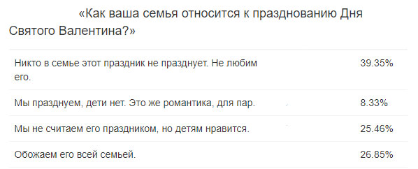 По результатам нашего опроса почти 40% читателей Tlum.Ru этот праздник недолюбливают и не празднуют. 26% опрошенных любят День святого Валентина и празднуют его всей семьей. На третьем месте (25%) следуют те, кто не считает 14 февраля поводом для праздника, но смиряются с тем, что дети его любят. И, наконец, всего 8% считают, что праздник хороший, но он не для детей.