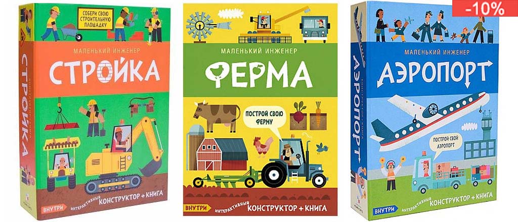 Также в продаже есть три разных весёлых конструктора «Маленький инженер»: «Стройка», «Ферма» и «Аэропорт». Если собрать их все, то можно построить целый город с жителями и придумывать ещё больше игр.