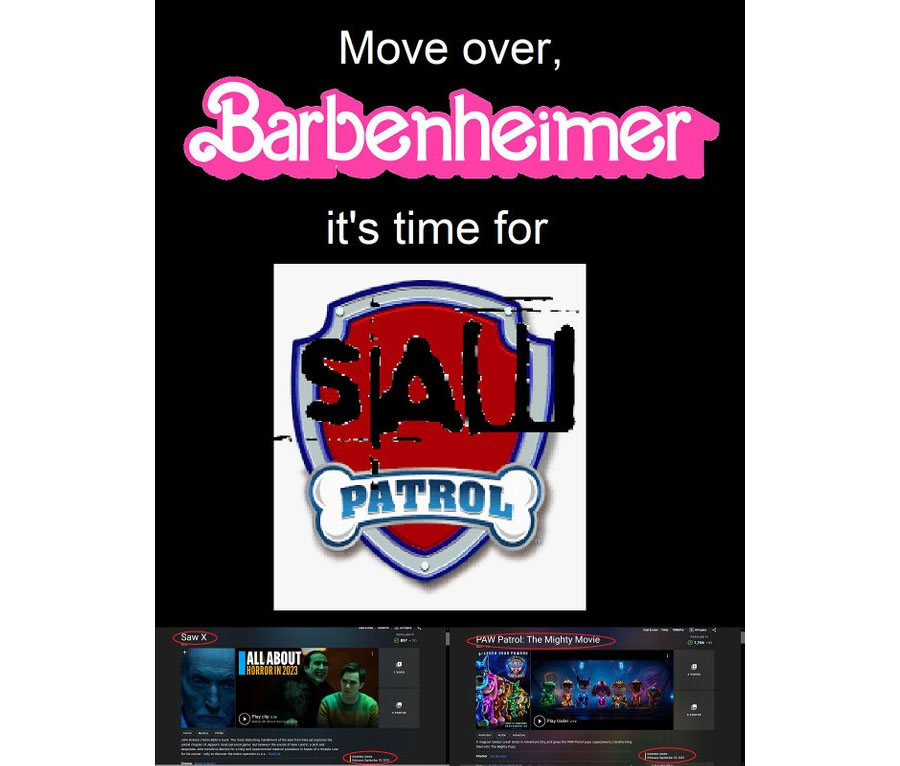 В-пятых, полнометражный мультфильм «Щенячий патруль: Мегафильм» выйдет в большой прокат осенью — 29 сентября. И похоже, что рекламщики, отвечающие за необходимые даты и прочее, решили устроить второй «Барбигеймер», ведь приключения щенков выйдут одновременно с новой частью франшизы «Пила». И что вы думаете? Верно, фанатские постеры и мемы начали активно появляться на просторах Интернета. Ни минуты покоя настоящим киноманам.