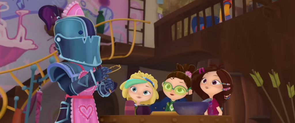 Многофункциональные Доспехи одновременно делают сразу несколько дел: создают вкуснейшее печенье по рецепту от Снежки и помогают Алисе выбрать ткань для наряда. Появись третье дело — и там бы успели. Разбивает бытовую сцену приход Железяки. Он доставляет Доспехам посылку.