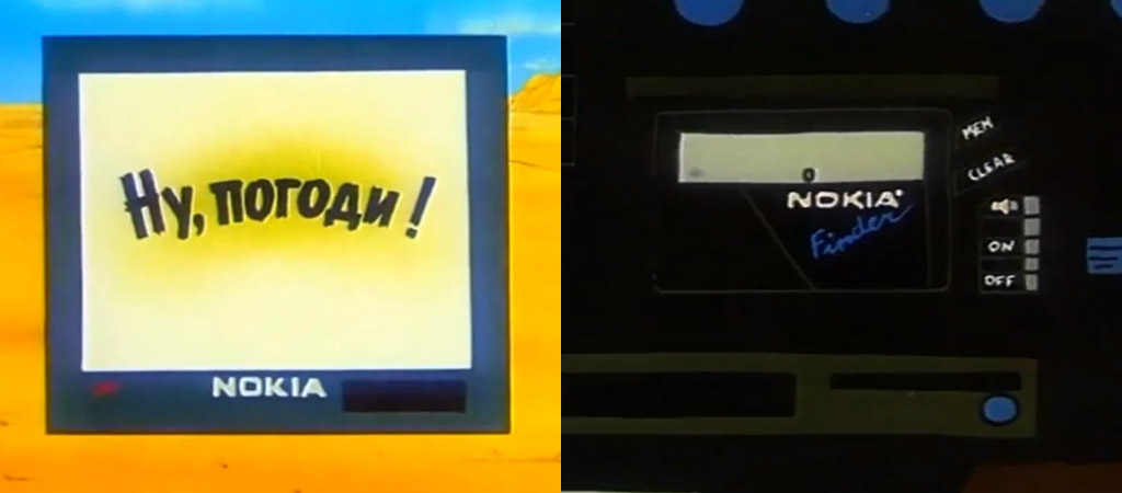 Ладно, давайте вспомним мультсериал «Ну, погоди!». Рекламу Nokia можно заметить в 17 и 18 выпусках.