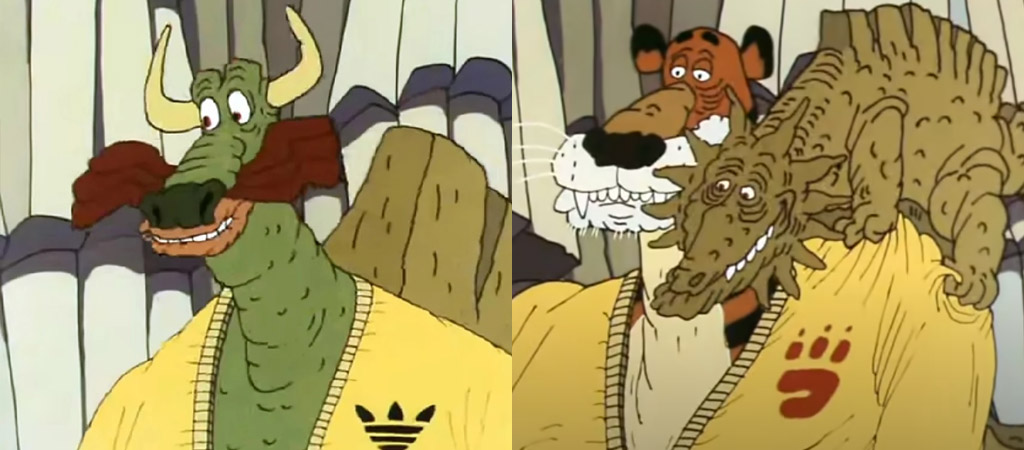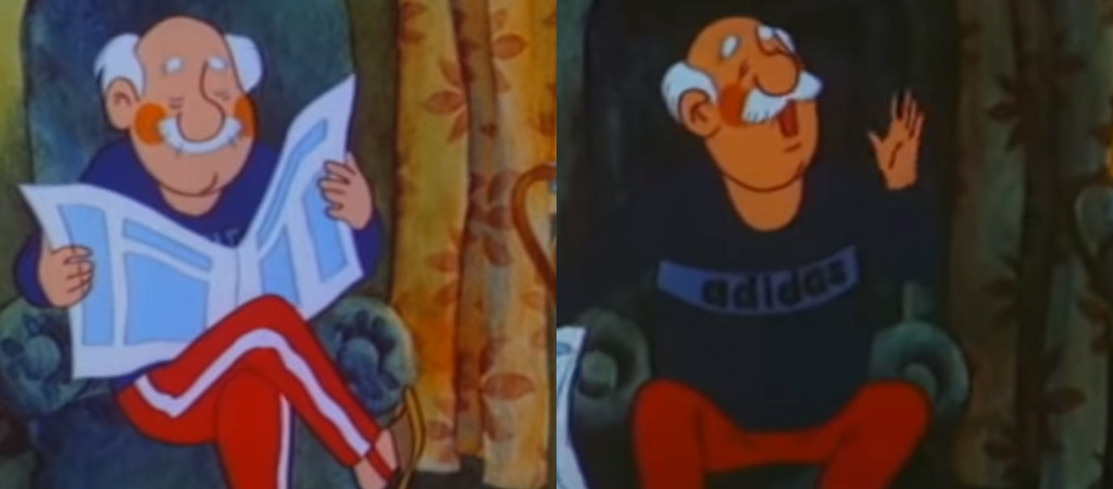 Если вы смотрели нашу подборку с 15-ю странными советскими мультфильмами, то не пропустили там мультфильм «Ух ты, говорящая рыба!», а рекламу в самом мультфильме заметили? Она была и там. Э-эх, пока разговаривает со старцем, перевоплощается, но в один момент на нём появляется куртка со старым логотипом Adidas, и он настолько старый, что современные зрители (да и покупатели) могут не понять, что это именно та фирма. Кадры в сцене мелькают быстро, секунда, и логотип меняется на отпечаток лапы.