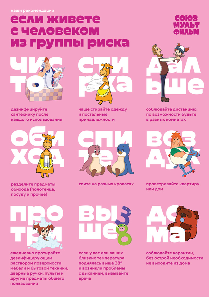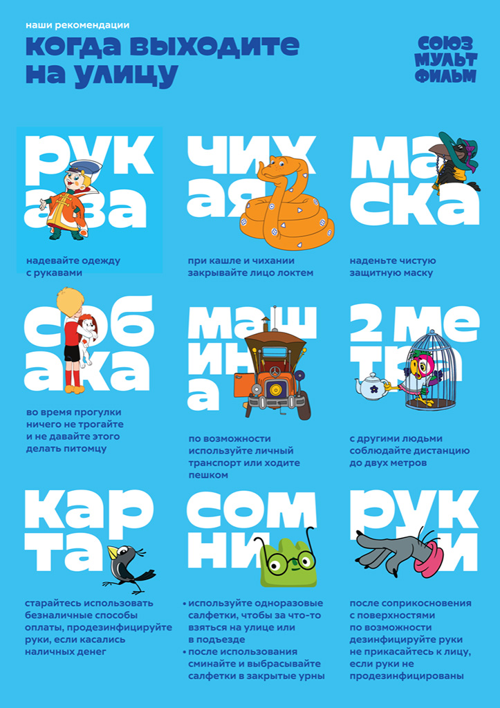 Для тех же, кто любит постеры и плакаты, студия также приготовила полезные информационные памятки. Родители, если ваши дети всё ещё не запомнили правила поведения при пандемии, то самое время распечатать эти постеры-памятки для лучшего усваивания информации. Да и пригодятся они людям всех возростов.