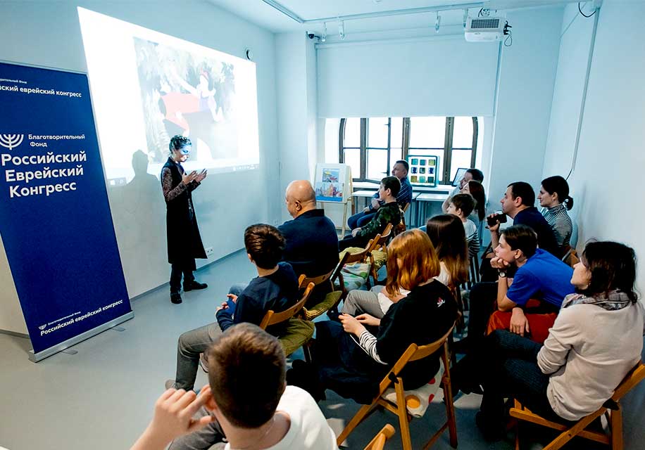 Jewish AdSchool — образовательный проект для детей 12−14 лет, совместно организованный Российским еврейским конгрессом и ММОМА. Послушать уникальную в своем роде тему пришли ученики школы, сами занимающиеся созданием мультфильмов в рамках учебного процесса, и их родители — в этот день у них на занятия приходили семьями.