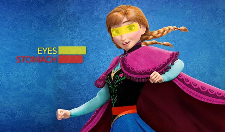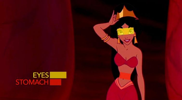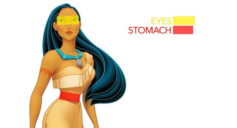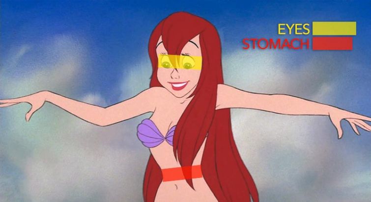 Студия Disney уже не раз (и не сто раз) подвергалась критике из-за того, что их образы принцесс очень далеки от реальных женских тел. Всё дело в сказочной непропорциональности и излишней стройности. И вот прямое и очень наглядное доказательство: на кадрах ниже жёлтым отмечены глаза героинь, а красным — их талии. Напоминаем, что даже у самых-самых худых реальных женщин эти параметры диаметрально противоположные: общая длина глаз всегда меньше, чем талия.
