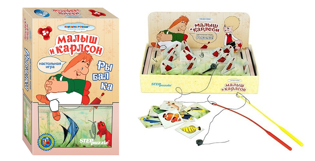 Что из себя представляет: поле, две магнитные удочки, карточки с рыбками и поплавками.