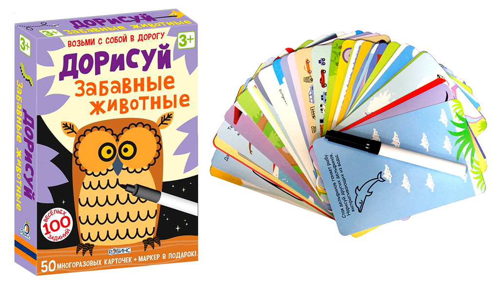 Что из себя представляет: колода из полусотни карт с всевозможными заданиями, головоломками, лабиринтами, словесными играми и прочим в том же ключе. Карточки ламинированные, что позволяет стирать нарисованное или написанное и выполнять задания неоднократно.
