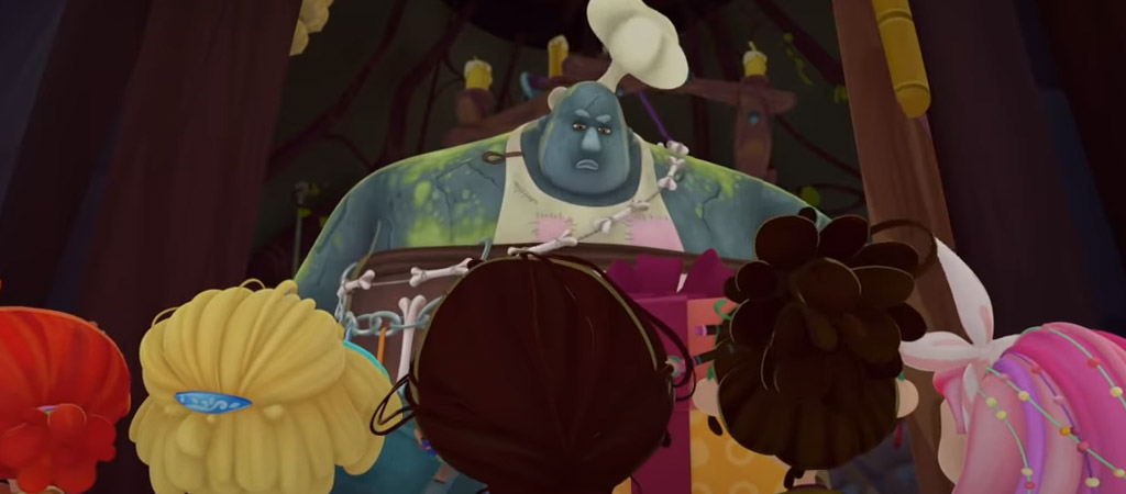 Во-первых, Алёнка, совершенно неподготовленная к подобным дружеским визитам и намекающая, что до подъёма наверх неплохо было бы перехватить кусочек подарочного торта. Во-вторых, Великан по неведомой причине встречает девочек довольно прохладно. И просит отвернуться, ведь собирается прятать их собственный подарок. В-третьих…
