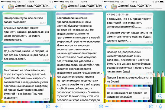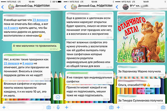 «Это кошмар какой-то! У нас, когда создали чат первые два месяца было до 900 сообщений в день!!! Про подарки, про сопли, про все болячки, какие игрушки в группу купить, на какие секции кто ходит, перед Новым годом вообще кошмар, когда решали какие подарки детям брать…».