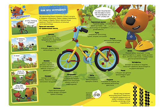 Кеша с Тучкой попросят детей помочь им посчитать улов, предложат вырезать объемную открытку, научат делать мыльные пузыри и объяснят, как устроен велосипед. Лисичка поделится несложными, интересными и, конечно, вкусными рецептами. И это далеко не все! Наклейки, игры-бродилки и много-много всего интересного.