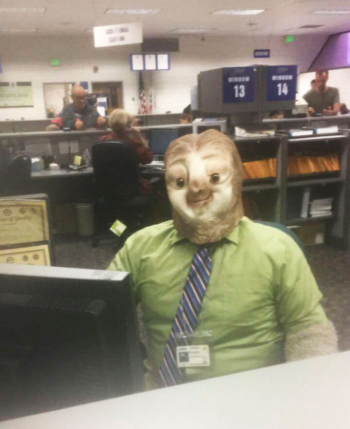 Самыми популярными нарядами на Хэллоуин традиционно являются различные монстры — вампиры, ведьмы и т. д. Но один из сотрудников отделения Департамента автотранспортных средств в США выбрал костюм, вызывающий неподдельный ужас у посетителей. Он превратился в ленивца Блица из мультфильма «Зверополис».
