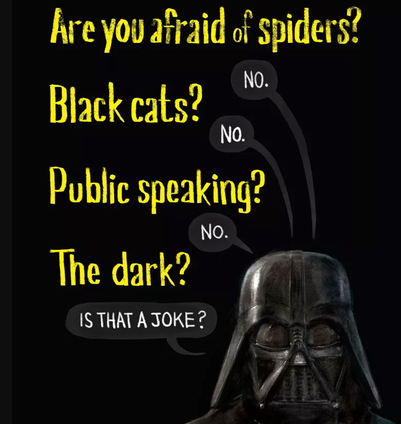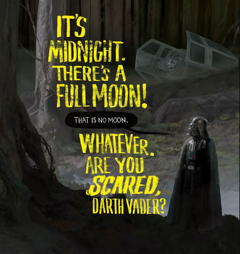 В этой книге Дарт Вейдер просто идет своей дорогой, а все вокруг пытаются его напугать — призраками, оборотнями и т. д. Но оказывается, что Темный Лорд ситхов почти ничего не боится. И дети, которые прочтут эту книгу, тоже должны начать решительнее бороться со своими страхами.