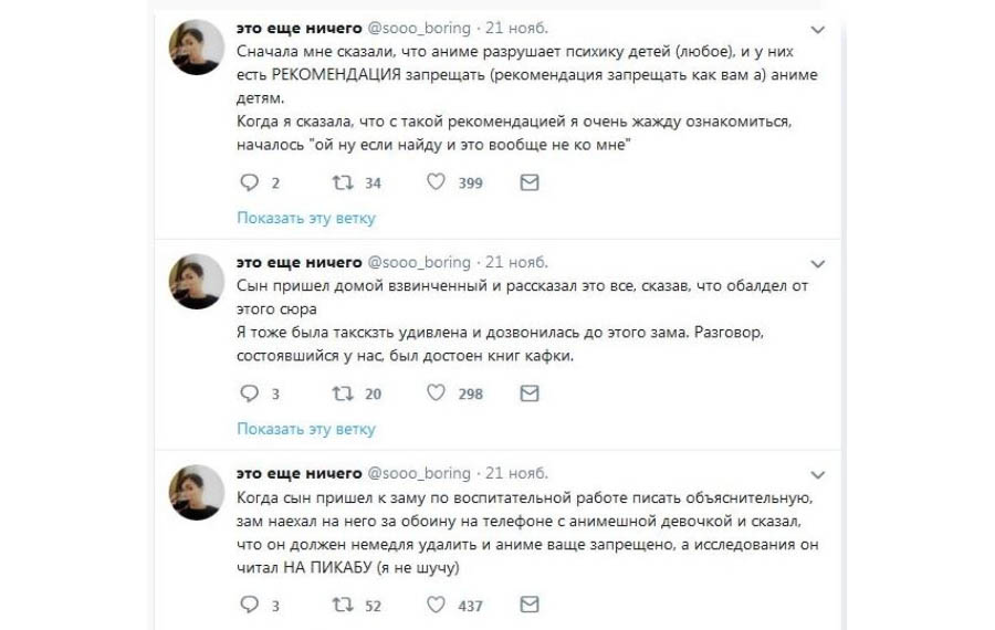 Мама решила сама позвонить завучу, чтобы выяснить, что же всё-таки произошло. По телефону ей объяснили, что аниме якобы плохо влияет на несформированную детскую психику, а в телефон смотрели, потому что «в школе личные вещи часто становятся общественными».