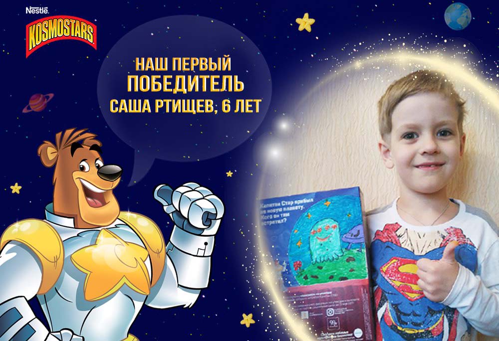 За смелость и участие каждый юный художник получит обязательный приз — «детскую» подписку в онлайн-кинотеатре Megogo.net, а шестеро победителей увидят свои работы напечатанными прямо на коробках Kosmostars. Да, свой рисунок на упаковке прямо на полке в магазине. Кстати, одного победителя уже определили и объявили: им стал Александр Ртищев. Поздравляем!